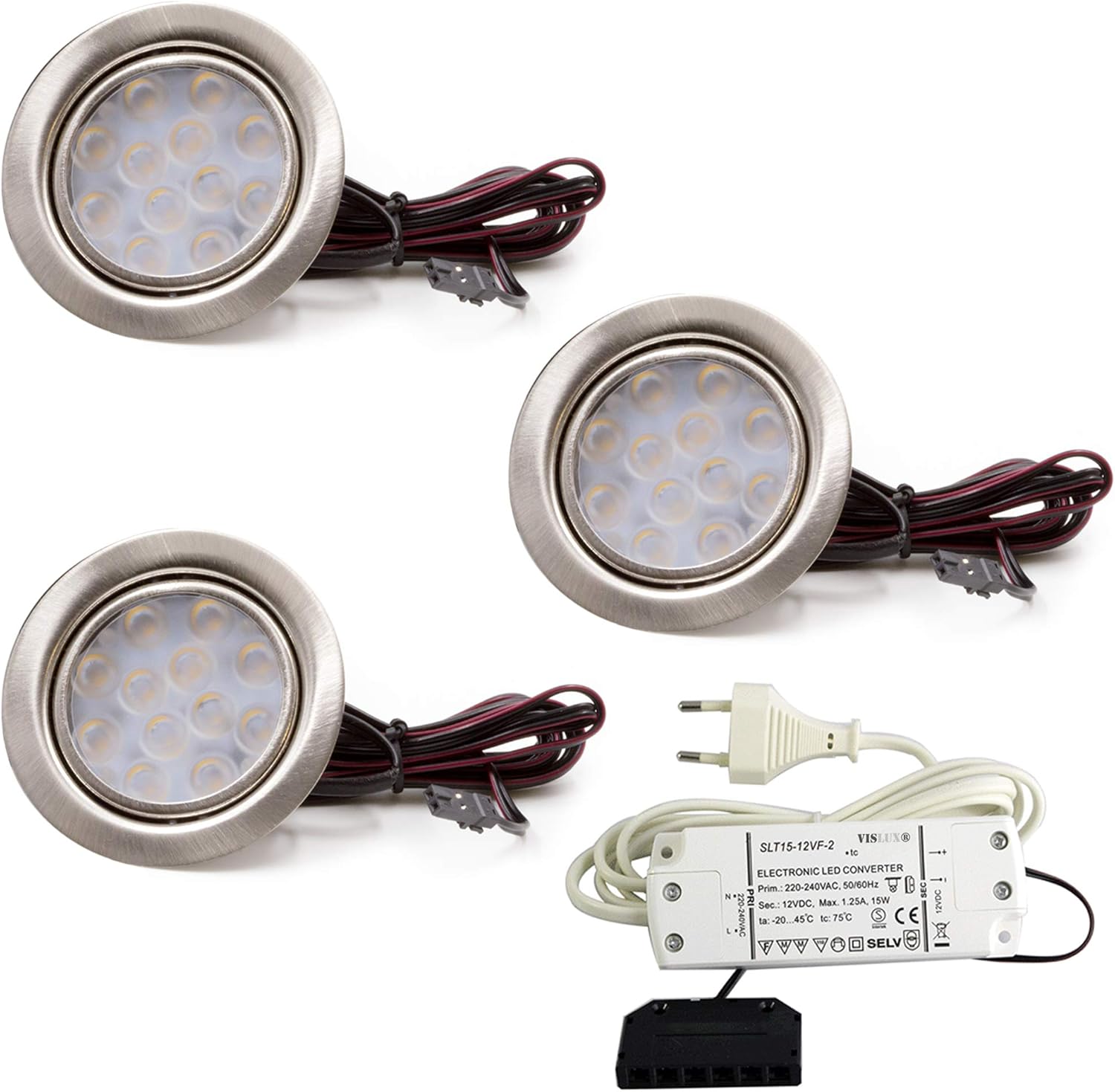 vislux 3er set led mobelleuchte einbaustrahler edelstahl geburstet flach 3w warmweiss 3200k 200lm 12v 15w led trafo 230v fur das wohnzimmer kuche und bad amazon de beleuchtung